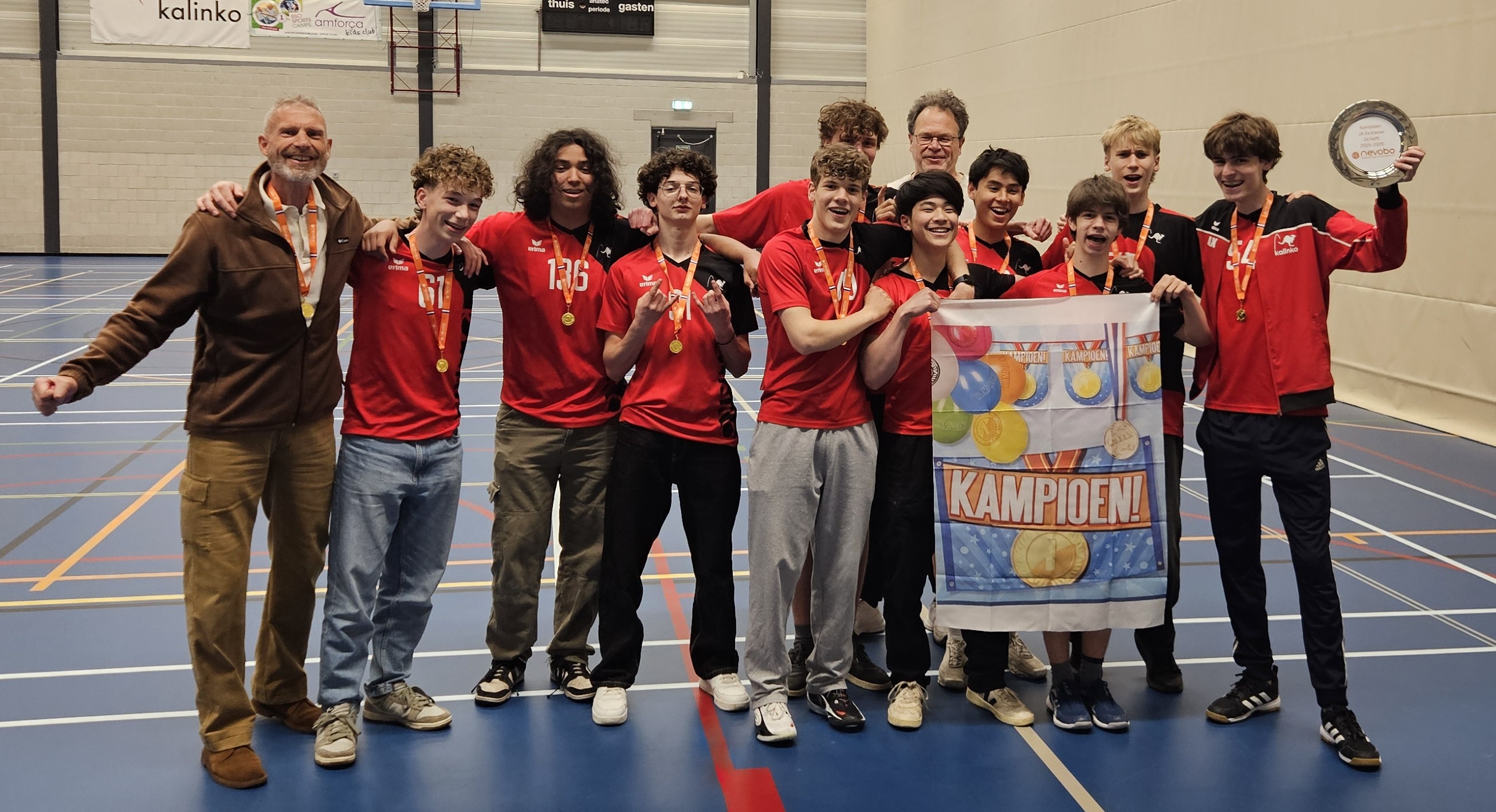 | Toen we net aan dit het seizoen begonnen bestond het team uit een groep jongens uit de JB en allemaal nieuwelingen. De eerste seizoenshelft moesten we daarom ook nog erg wennen en groeien in niveau. De groei van het team en van alle spelers na de eerste seizoenshelft laat zien hoe gemotiveerd dit team is. En nu heeft dat zelfs geleid tot winst en dus kampioen van de tweede seizoenshelft. Tuurlijk hebben wij als spelers bijgedragen aan dat wij nu kampioen zijn. Maar zonder onze fantastische coach Richard was dat natuurlijk nooit gelukt. |